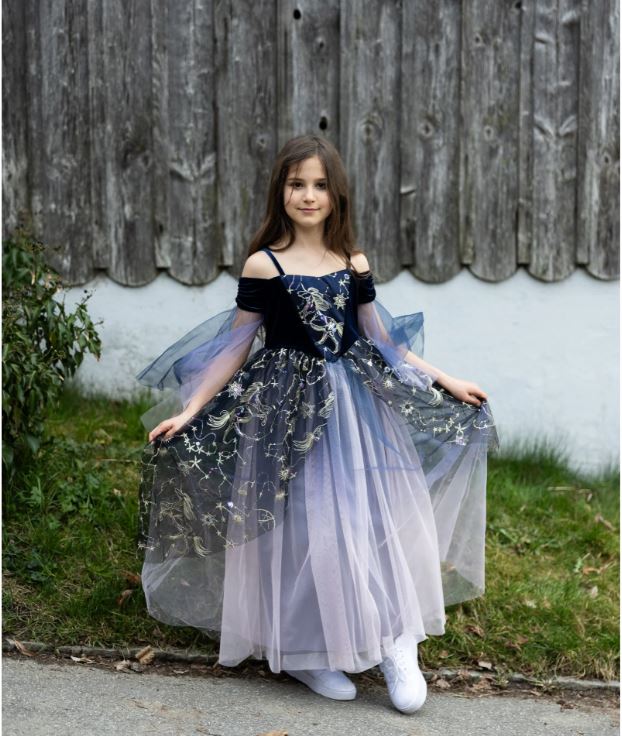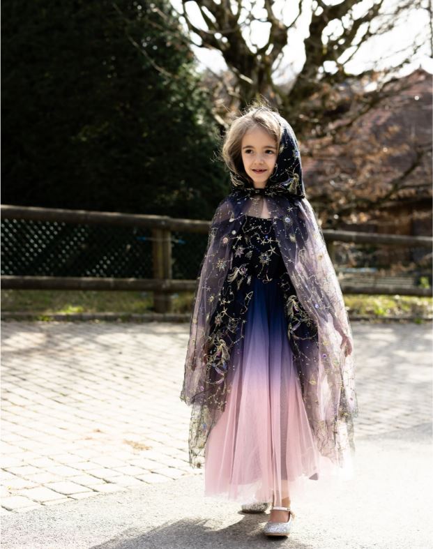 Le maniche in velluto morbido scoperte sulle spalle aggiungono un tocco regale, garantendo al tempo stesso comfort per ore di gioco magico. Il vero protagonista è la gonna fluente in tulle sfumato, che degrada da un intenso viola crepuscolare a un rosa cipria delicato, creando un effetto etereo e raffinato, ideale per danzare e immaginare mondi incantati.