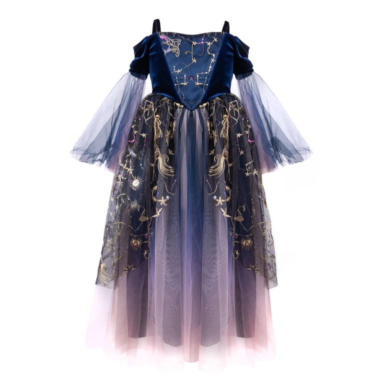Questo abito spettacolare è pensato per stupire, con un corpetto in tessuto viola scuro ricamato con stelle dorate e delicate costellazioni che brillano ad ogni movimento.