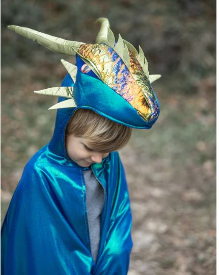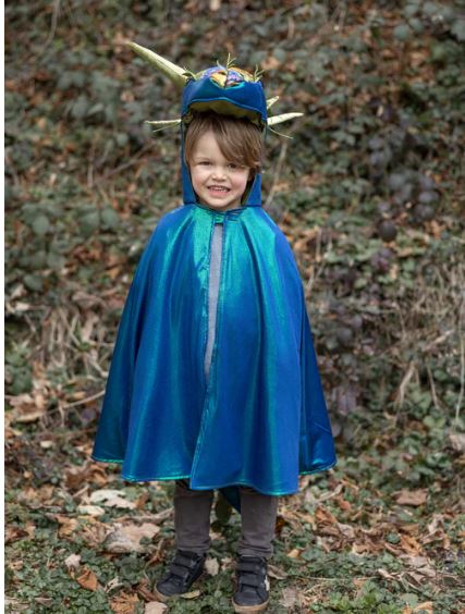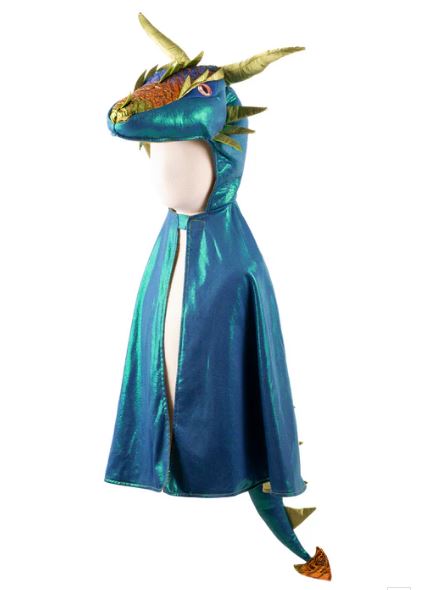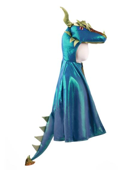 Il Mantello Emerald the Dragon non è un semplice mantello, ma una vera porta d’accesso a un mondo di immaginazione e creatività. Realizzato in tessuto metallico blu smeraldo brillante e foderato in raso verde intenso, cattura immediatamente l’attenzione e stimola la curiosità, invitando i bambini a dare libero sfogo alla fantasia.