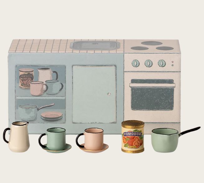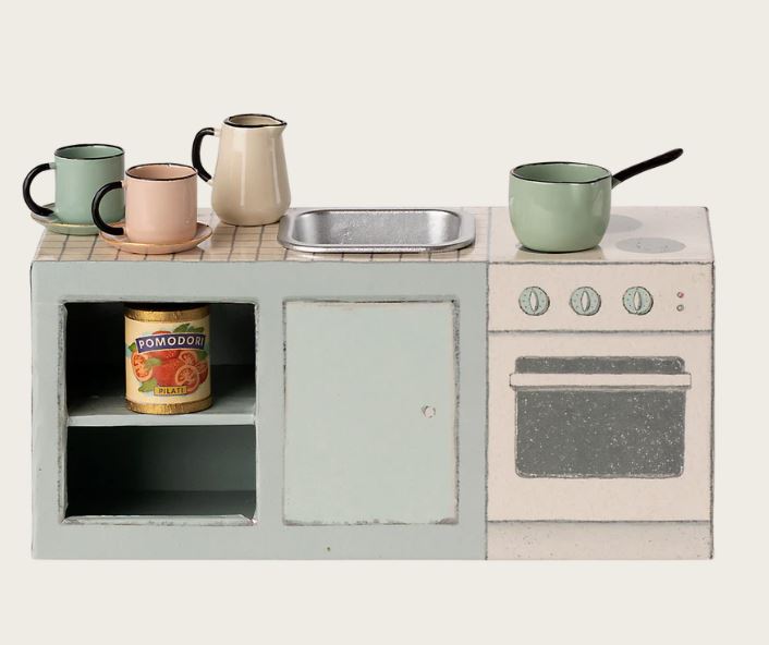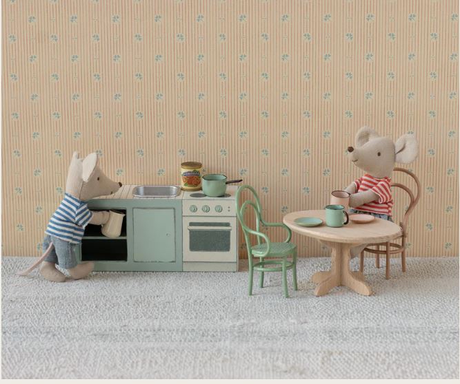 Un delizioso mobile cucina in miniatura, perfetto per arricchire la casa dei topolini e creare scene quotidiane piene di fantasia nell’universo Maileg. Ideale per inventare momenti di convivialità, preparare pranzetti immaginari e dare vita a storie domestiche curate nei dettagli.