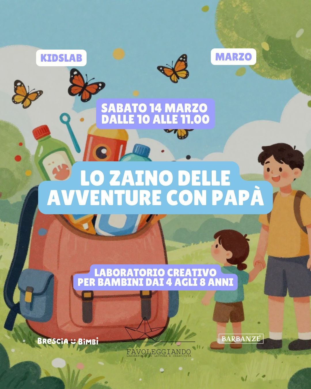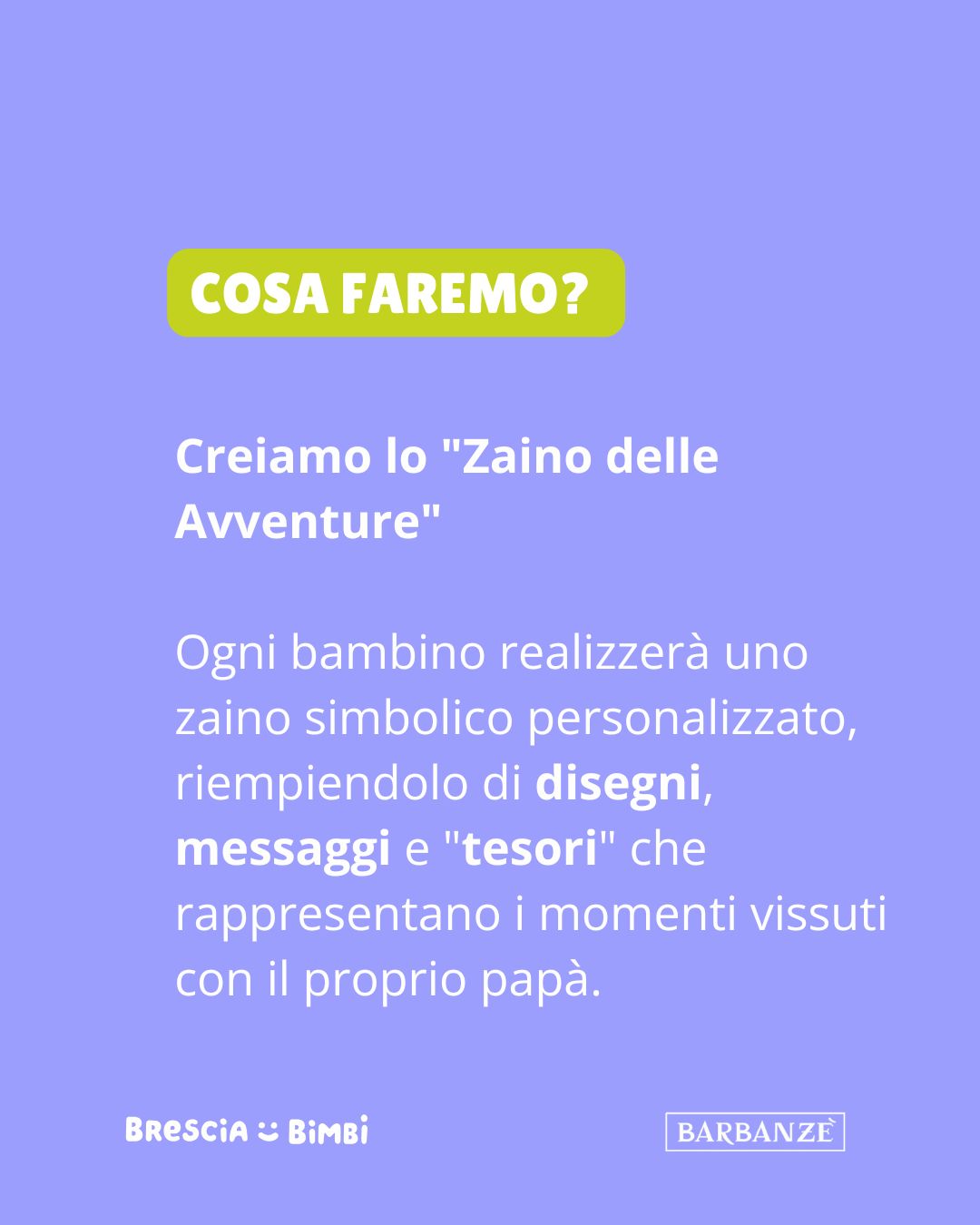 Sotto la guida di esperte, ogni bambino realizzerà uno zaino simbolico personalizzato. Utilizzando cartoncini, materiali di riciclo, colori e piccoli messaggi, i partecipanti potranno "riempire" il proprio zaino con i tesori delle avventure vissute con il proprio papà.